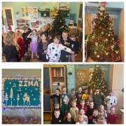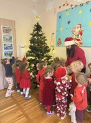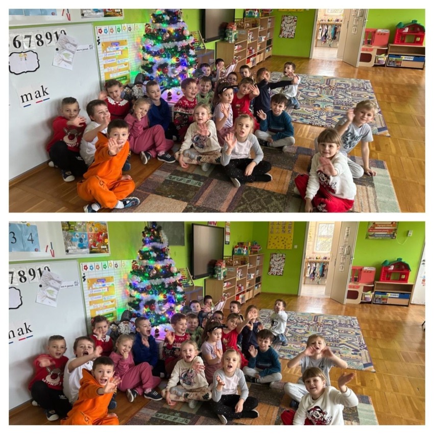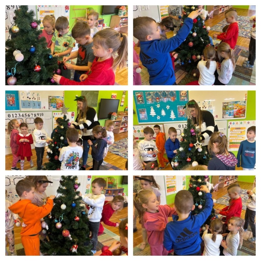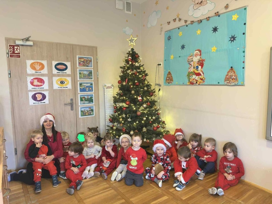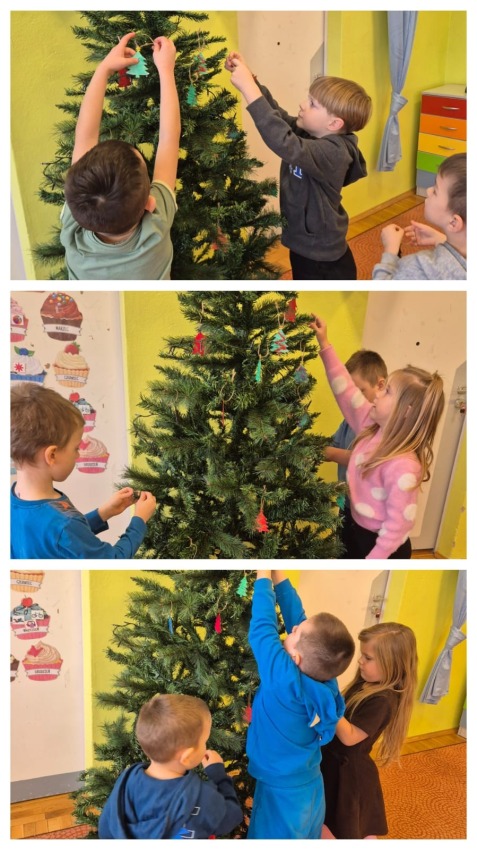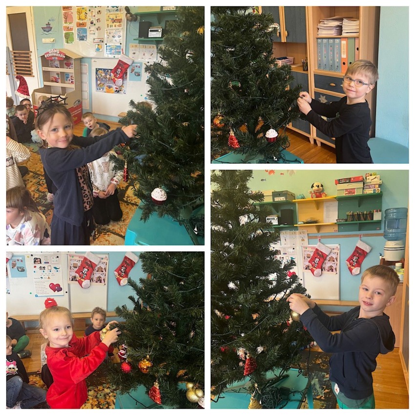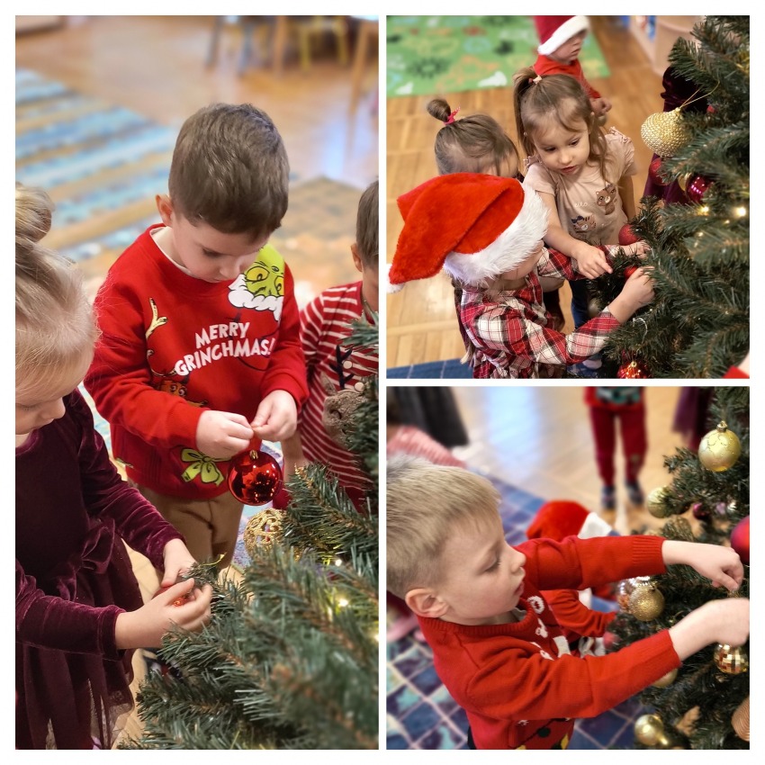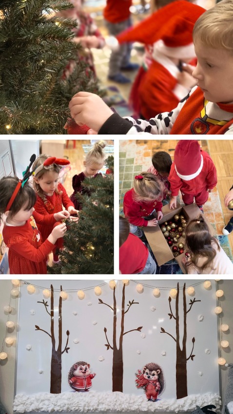 W przedszkolu panowała prawdziwa świąteczna atmosfera – każda grupa ubierała w swojej sali choinkę. Najstarsza grupa, „Żabki”, przygotowała na tę okazję własnoręcznie wykonane bombki, które z dumą zawiesiła na zielonych gałązkach. Dzięki temu choinki w całym przedszkolu stały się kolorowe, wyjątkowe i pełne dziecięcej radości.
