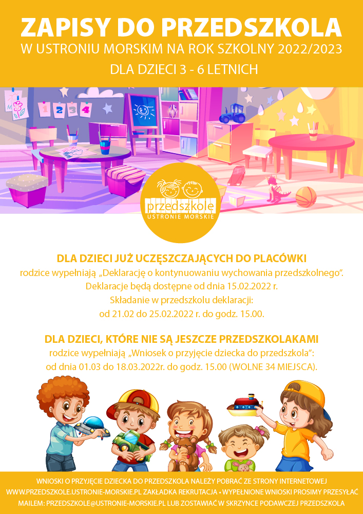 ZAPISY DO PRZEDSZKOLA W USTRONIU MORSKIM NA ROK SZKOLNY 2022/2023 DLA DZIECI 3 - 6 LETNICH